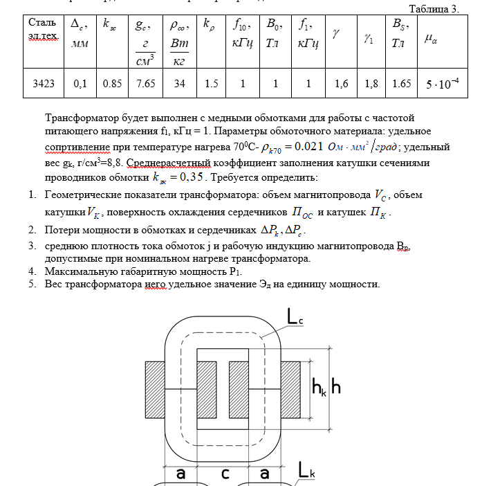 Трансформатор будет выполнен с медными обмотками для работы с частотой питающего напряжения f1, кГц = 1. Параметры обмоточного материала: удельное сопротивление при температуре нагрева 700С-; удельный вес gk, г/см3=8,8. Среднерасчетный коэффициент заполнения катушки сечениями проводников обмотки . Требуется определить: