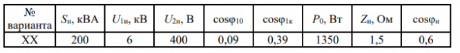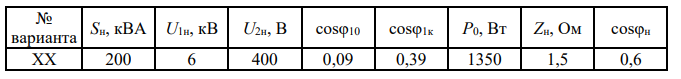 Однофазный трансформатор характеризуется следующими номинальными величинами: мощность Sн; высшее (первичное) напряжение U1н; низшее (вторичное) напряжение U2н. Мощность потерь холостого хода Р0 (при U1 = U1н); коэффициенты мощности: при холостом ходе cosφ10, при коротком замыкании cosφ1к; процентное значение напряжения короткого замыкания uк = 5,5%. Определить: а) ток холостого хода трансформатора; б) коэффициент трансформации; в) параметры полной схемы замещения трансформатора; г) напряжение U2, если к трансформатору присоединён приемник энергии с параметрами Zн, cosφн. Начертить схему замещения трансформатора и нанести на ней параметры всех элементов схемы. Исходные данные в таблице 2.1.