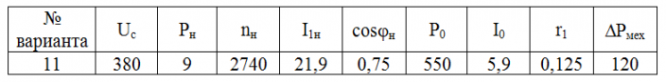 Асинхронный трехфазный двигатель (число пар полюсов = 1, частота напряжения 50 Гц) при напряжении сети Uс = 380 В развивает номинальную мощность Рн = 9 кВт, вращаясь с частотой nн =2740 об/мин и потребляя ток I1н =21,9 А при коэффициенте мощности cosjн =0,75. В режиме холостого хода двигатель потребляет из сети мощность Р0 = 550 Вт при токе I0 = 5,9 А. Активное сопротивление обмотки статора r1 = 0,125 Ом, механические потери мощности DPмех = 120 Вт. Схема соединения обмотки статора – «звезда». Определить потери мощности в меди статора и ротора, потери в стали, добавочные потери при нагрузке, коэффициент полезного действия, электромагнитный момент, момент на валу для номинального режима работы двигателя.