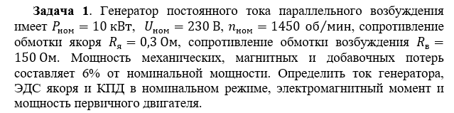 Задача 1. Генератор постоянного тока параллельного возбуждения имеет , , , сопротивление обмотки якоря , сопротивление обмотки возбуждения . Мощность механических, магнитных и добавочных потерь составляет 6% от номинальной мощности. Определить ток генератора, ЭДС якоря и КПД в номинальном режиме, электромагнитный момент и мощность первичного двигателя.