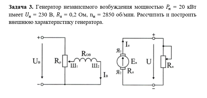 Генератор независимого возбуждения мощностью = 20 кВт имеет = 230 В, = 0,2 Ом, = 2850 об/мин. Рассчитать и построить внешнюю характеристику генератора.