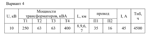 Задание 1. Задана схема сети напряжением U, кВ, приведенная на рисунке 1, и параметры сети: длины участков сети, км, их марки проводов и номинальные мощности трансформаторов, кВА. Ток головного участка в режиме наибольших нагрузок i, А. Время использования наибольшей нагрузки всех потребителей, подключенных к сети, Tнб, ч. Определить годовые потери электроэнергии методом эквивалентного сопротивления и вероятностно-статистическим методом.