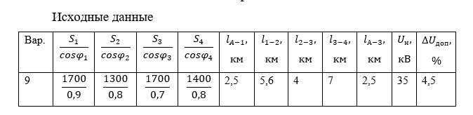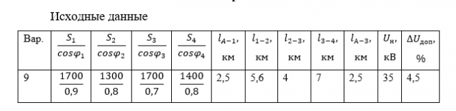 Определить наибольшую потерю напряжения в разомкнутой трехфазной сети 380 В, выполненную кабелем и воздушными линиями. Симметричные по фазе нагрузки в амперах, их коэффициенты мощности cosφ, длины участков в км даны на схеме сети (Рисунок 2.1). Голов