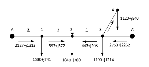 Найти токораспределение в кольцевой сети 10 кВ (Рисунок 3.1), выполненной кабелем СБ10-3х35 с сечением медных жил 35 мм2 и воздушной линией с проводами А50. нагрузка в амперах и длины участков сети в километрах приведены на схеме. погонные параметры