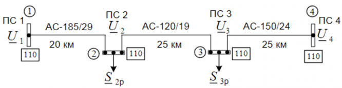 Схема участка сети с двухсторонним питанием (ПС1 и ПС4), исследуемая в ходе лабораторной работы, изображена на рисунке