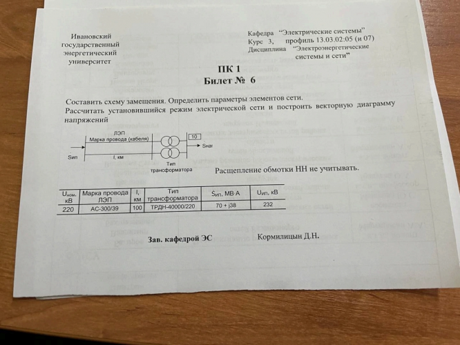 Для студентов ИГЭУ им. Ленина по предмету Электрические сетиСоставить схему замещения. Определить параметры сети. Рассчитать установившийся режим электрической сети и построить векторную диаграмму напряженийСоставить схему замещения. Определить параметры сети. Рассчитать установившийся режим электрической сети и построить векторную диаграмму напряжений
