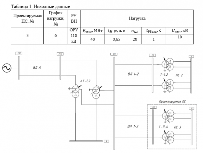 Исходные данные представлены в виде таблиц, схем прилегающей сети и типовых графиков нагрузок. Для выполнения курсового проект студенту выдаётся задание. Задание выдает преподаватель в соответствии со схемой сети, представленной в курсовой работе по дисциплине «Электрические системы и сети». В параметры, выдаваемые преподавателям, входят: номер проектируемой ПС, номер графика нагрузки, вид конструктивного выполнения РУ ВН, а также параметры питающей системы нагрузки на напряжении 10 кВ.