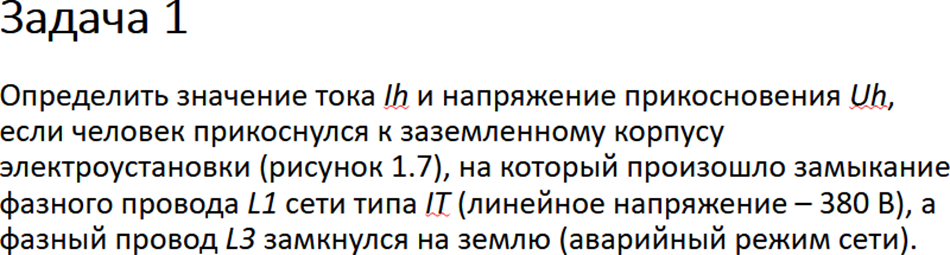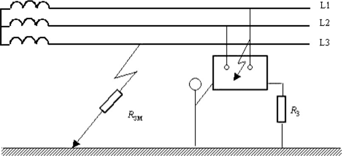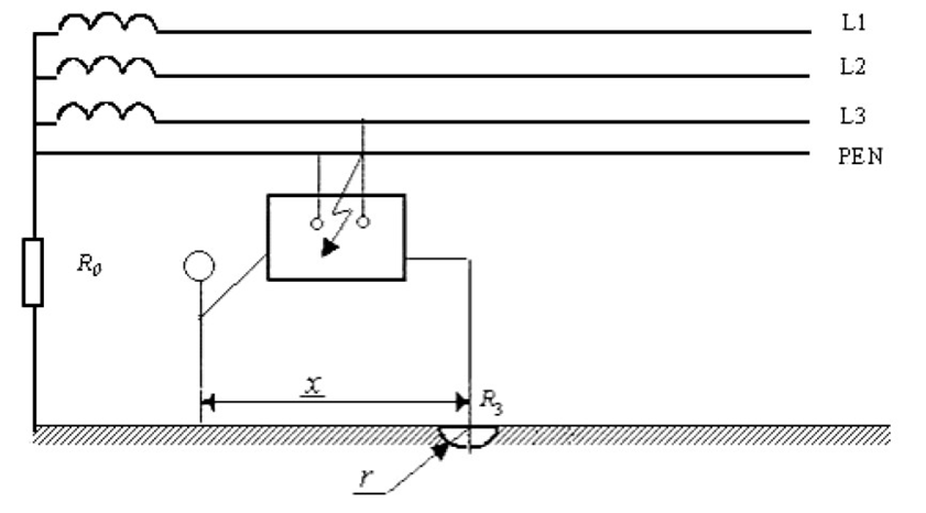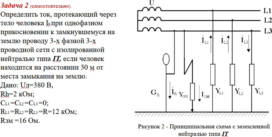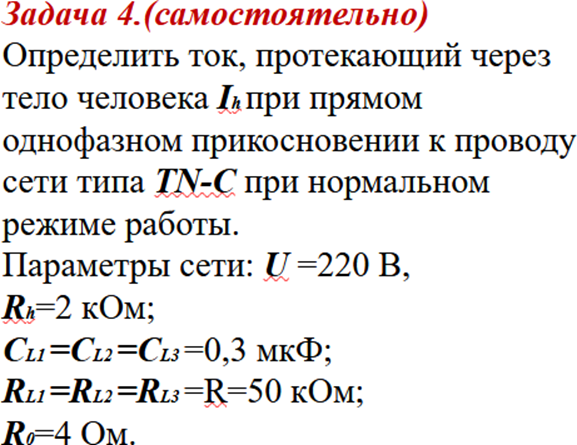 Дано: Rз = 4 Ом, Rзм = 32 Ом, RL1 = RL2 = RL3 = R = 15 кОм; человек находится на расстоянии 10 м от заземлителя; Rh = 1 кОм; Rосн = 1 кОм; сеть короткая.