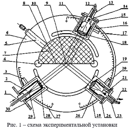 15, 24 — кольца для изменения поляризации излучения передающей антенны 17, 25, 27 — шкалы для отсчета углов преломления, отражения и падения