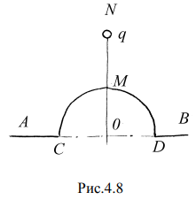 На бесконечной плоской поверхности проводника имеется сферический бугор CMD радиусом R, центр которого лежит на той же плоскости (см. рис. 4.8). На оси симметрии системы на перпендикуляре к поверхности MN вне проводника на расстоянии a от центра сферы расположен точечный заряд q. Найдите потенциал во всем пространстве.