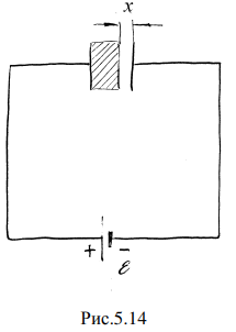 Плоский конденсатор, пластины которого имеют площадь S и расположены на расстоянии d друг от друга, заполнен твердым диэлектриком с диэлектрической проницаемостью ε (рис. 5.14). Конденсатор подсоединен к батарее с ЭДС равной ε. Одну из пластин конденсатора отодвигают так, что образуется воздушный зазор. На какое расстояние x была отодвинута пластина, если при этом произведена работа A?
