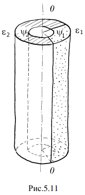 Найдите напряженность электрического поля в длинном цилиндрическом конденсаторе, пространство между обкладками которого заполнено однородными диэлектриками с диэлектрическими проницаемостями ε1 и ε2 (см. рис. 5.11). Диэлектрики граничат между собой вдоль плоскостей, пересекающихся на оси цилиндра О. Двугранные углы, образуемые ими в диэлектриках, равны соответственно ψ1 и ψ2 (ψ1 + ψ2 = 2π). Длина конденсатора равна l, а заряд на внутренней обкладке Q. Найдите также емкость конденсатора, если радиусы цилиндрических обкладок равны R1 и R2 (R1 < R2).
