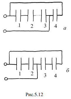 Батарея из четырех конденсаторов включена один раз по схеме а), а другой раз по схеме б) (рис. 5.12).