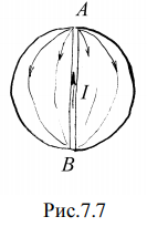 Внутри однородной проводящей сферы от точки А к точке В (см. рис. 7.7) по диаметру большого круга проходит проводник. Ток силы I идет от В к А по проводнику, а затем по сфере к точке В. Определите индукцию магнитного поля B, создаваемого этими токами, внутри и вне сферы.