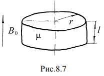 Тонкий диск радиусом r и высотой l (l<<r), сделанный из магнетика с магнитной проницаемостью µ, помещен во внешнее однородное магнитное поле с индукцией B0, направленной перпендикулярно плоскости диска (рис. 8.7). Найдите индукцию магнитного поля в центре диска (т.О).