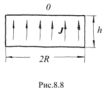 Постоянный магнит в виде тонкого диска радиусом R намагничен однородно (рис. 8.8). Вектор намагниченности J перпендикулярен плоскости диска. Найдите напряженность магнитного поля внутри диска вблизи его центра, если толщина диска h.