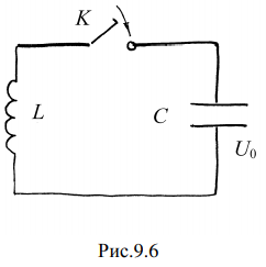 Конденсатор емкостью С=1 мкФ, заряженный до напряжения U0=12 В, соединен с катушкой индуктивностью L=10 мГн, через ключ (рис. 9.6). Каково может быть максимальное значение силы тока в этой цепи после замыкания ключа?