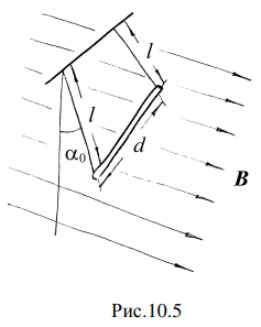 Две параллельных невесомых непроводящих нити, закрепленные в верхних точках, и тонкая проводящая палочка длины d образуют «качели», способные качаться в однородном постоянном магнитном поле, линии индукции которого горизонтальны и перпендикулярны отрезку, соединяющему точки подвеса нитей (см. рис. 10.5). Длина каждой нити – l, индукция магнитного поля – B, а начальный угол отклонения качелей – α0 (качели отпускают из этого положения в момент t=0 без начальной скорости). Найдите зависимость от времени разности потенциалов между концами палочки.