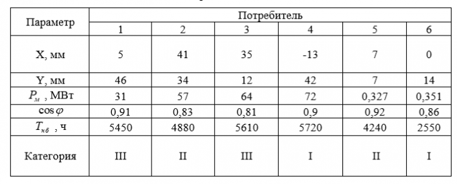 Необходимо произвести электроснабжение расположенных в 6 пунктах потребителей от крупного источника электроэнергии. Четыре потребителя характеризуются достаточно большой мощностью, соответствующей необходимости выбора для них районной подстанции или главной понизительной подстанции крупного предприятия. Для этой группы потребителей электроэнергия должна быть преобразована на напряжение 10 кВ. Два потребителя имеют относительно небольшую мощность и расположены недалеко от одного из крупных потребителей. Ими могут быть небольшие промышленные и сельскохозяйственные предприятия, жилые районы и населённые пункты. Электроснабжение этих потребителей предполагается осуществить от подстанций соответствующих крупных потребителей и обеспечить напряжением 380 В. Исходные данные приведены в таблице 1.