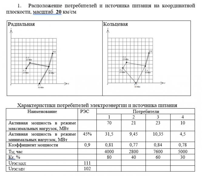Главная цель курсового проекта – выбор и обоснование по техническим и экономическим характеристикам электрической сети 110-220 кВ, которая будет обеспечивать надежность и бесперебойную передачу электроэнергии потребителю согласно ГОСТ 32144-2013. В данной работе необходимо провести расчет двух вариантов схем энергоснабжения: радиальной и кольцевой. Для каждой из них: рассчитать и выбрать марку проводов для ВЛ, количество и марку трансформаторов на подстанциях и провести для них все необходимые проверки, выполнить технико-экономический расчет.