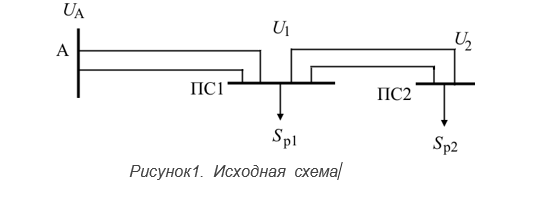Двухцепная электропередача 110кВ питает две подстанции, расчетные нагрузки которых Sр1=25+j12 МВ·А , Sр2=20+j10МВ·А . Параметры схемы замещения линии А1: RA1=2,36Oм, ХА1=8,017Ом, QcA1/2=1,376 Мвар. Для линии 12 : R12=2,44Oм, ХА1=4,229 Ом. Напряжение на шинах ИП равно UA=115кВ. Рассчитать напряжение на ПС1 U1 и на ПС2 U2 и мощность, выдаваемую ИП в сеть SA..
