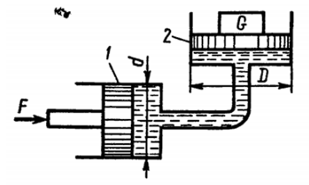 Определить давление в гидросистеме и вес груза G, лежащего на поршне 2, если для его подъема к поршню 1 приложена сила . Диаметры поршней . Разностью высот пренебречь.