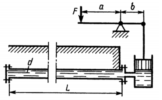 Для проверки герметичности трубопровода применяют ручной поршневой насос. Определить объем воды (модуль упругости ), который нужно накачать в трубопровод для повышения избыточного давления в нем от . Считать трубопровод абсолютно жестким. Размеры трубопровода: длина , диаметр . Чему равно усилие на рукоятке насоса в последний момент процесса проверки, если диаметр поршня , а соотношение плеч рычажного механизма, ?