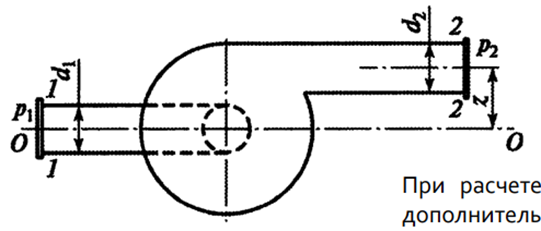 Имеется центробежный насос производительностью , состоящий из всасывающего и нагнетательного трубопроводов. На входе во всасывающий трубопровод диаметром давление составляет , в нагнетательном трубопроводе диаметром , находящемся на высоте над осью всасывающего трубопровода, давление . Определить гидравлическую мощность насоса.