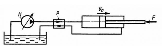 Определить давление, создаваемое насосом, и его подачу, если преодолеваемая сила вдоль штока , скорость перемещения поршня . Учесть потерю давления на трение в трубопроводе, общая длина которого , диаметр . Каждый канал распределителя по сопротивлению эквивалентен длине трубопровода . Диаметр поршня , площадью штока пренебречь. Вязкость масла , плотность –