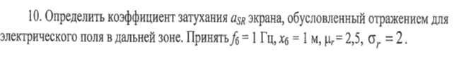 Определить коэффициент затухания экрана, обусловленный отражением для электрического поля в дальней зоне. Принять f6 = 1 Гц, х6 = 1 м, ц, = 2,5, о, = 2.
