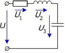Определить приложенное напряжение, если напряжения на участках цепи U1 = 40, U2 = 60, U3 = 30.