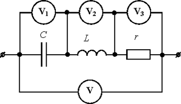 Определить показания вольтметра V, если UV1 = 100, UV2 = 70, UV3 = 40.