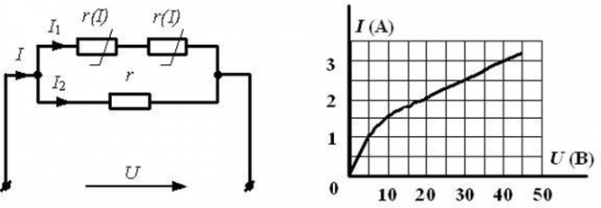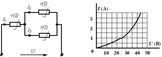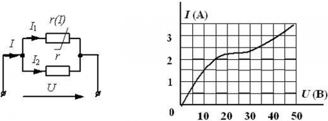 В нелинейной электрической цепи к сопротивлению R 1 приложено напряжение 10 В . Определите ток, протекающий через сопротивление R 2.