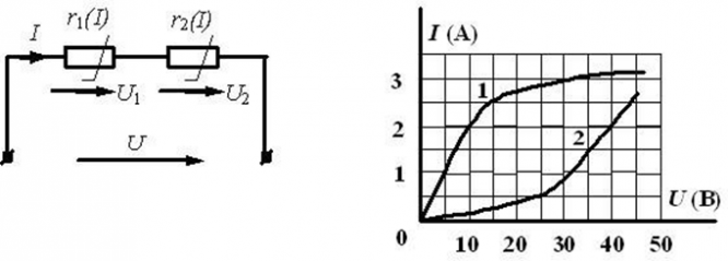 В нелинейной электрической цепи на сопротивление R 2 падает напряжение 10 В. Определите напряжение на сопротивлении R 1.