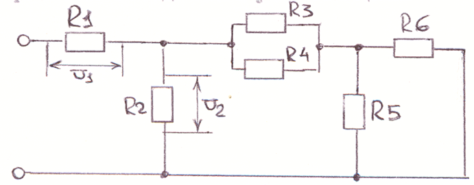 Задание 1. Для цепи на рисунке 5 известно, что U1 = 80 В, R1 = 35 Ом, R2 = 20 Ом, R3 = 16 Ом, R4 = 24 Ом, R5 = 18 Ом, R6 = 30 Ом. Определить общее сопротивление цепи, токи и напряжения на отдельных участках цепи.