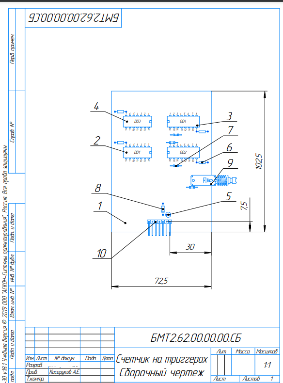 ​​​​Проектирование последовательного устройства – счетчика с произвольным порядком счета. Разработка принципиальной схемы, перечня элементов для нее, сборочного чертежа и спецификации, а также электрической разводки платы счетчика.