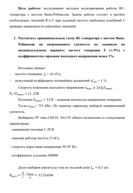 Цель работы: исследование методом моделирования работы RCгенератора с мостом Вина-Робинсона. Задача работы состоит в расчёте необходимых значений R и C при заданной частоте свободных колебаний f, проверке правильности найденных значений.