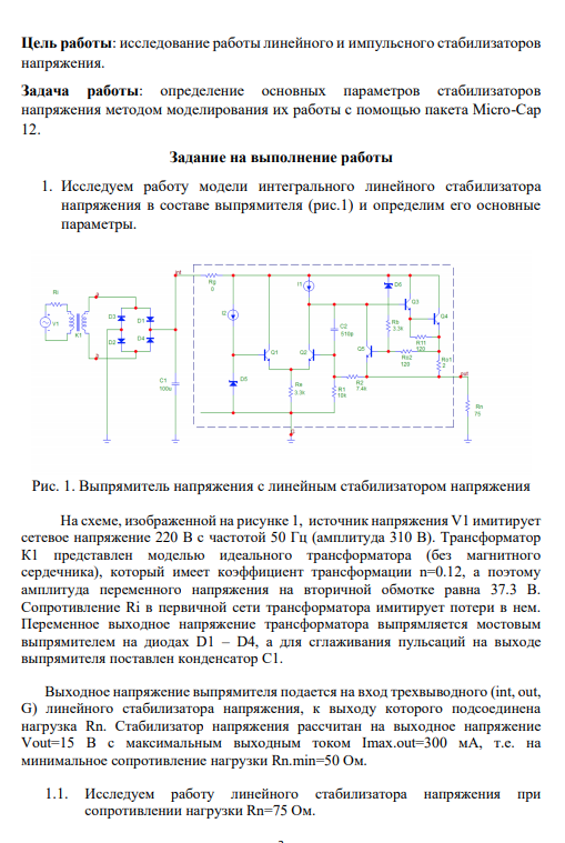 Задача работы: определение основных параметров стабилизаторов напряжения методом моделирования их работы с помощью пакета Micro-Cap 12.