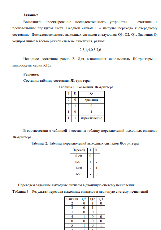 Задание: Выполнить проектирование последовательного устройства – счетчика с произвольным порядком счета. Входной сигнал С – импульс перехода к очередному состоянию. Последовательность выходных сигналов следующая: Q3, Q2, Q1. Значения Q, кодированные в восьмеричной системе счисления, равны: