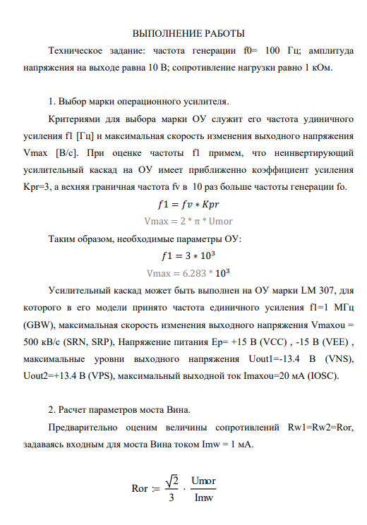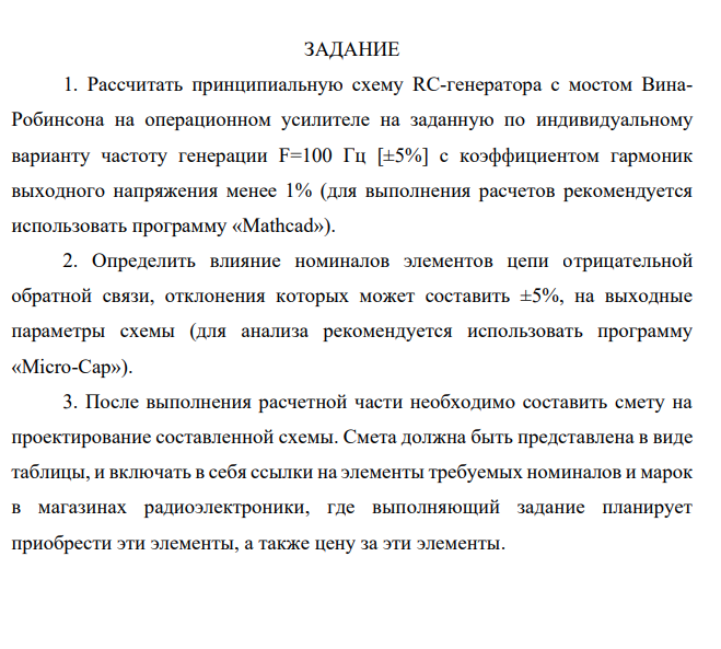 1. Рассчитать принципиальную схему RC-генератора с мостом ВинаРобинсона на операционном усилителе на заданную по индивидуальному варианту частоту генерации F=100 Гц [±5%] с коэффициентом гармоник выходного напряжения менее 1% (для выполнения расчетов рекомендуется использовать программу «Mathcad»).
