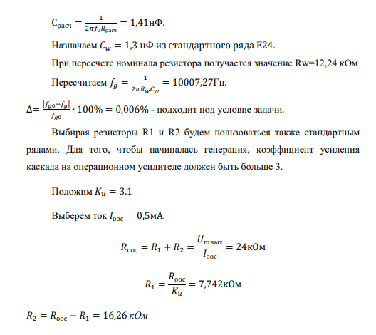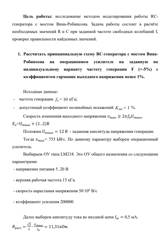 Цель работы: исследование методом моделирования работы RCгенератора с мостом Вина-Робинсона. Задача работы состоит в расчёте необходимых значений R и C при заданной частоте свободных колебаний f, проверке правильности найденных значений