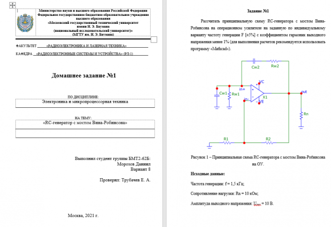 Для студентов МГТУ им. Н.Э.Баумана по предмету ЭлектроникаВариант 8 - ДЗ №1 - RC-генератор с мостом Вина-РобинсонаВариант 8 - ДЗ №1 - RC-генератор с мостом Вина-Робинсона