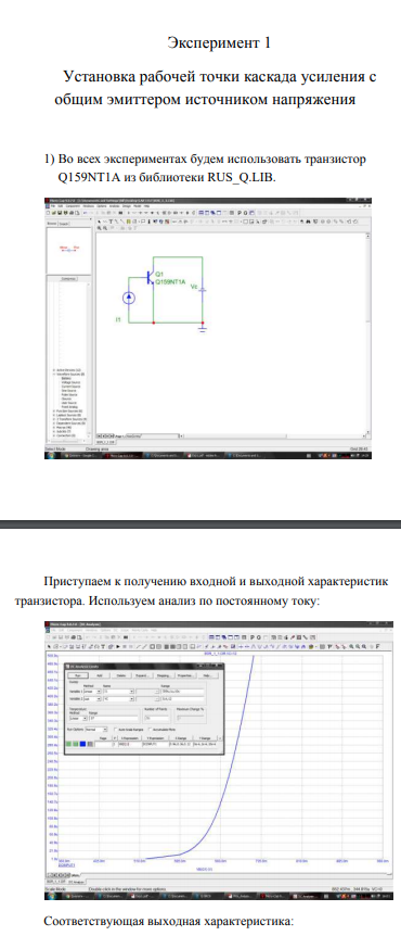 Эксперимент 1 Установка рабочей точки каскада усиления с общим эмиттером источником напряжения 1) Во всех экспериментах будем использовать транзистор Q159NT1A из библиотеки RUS_Q.LIB.
