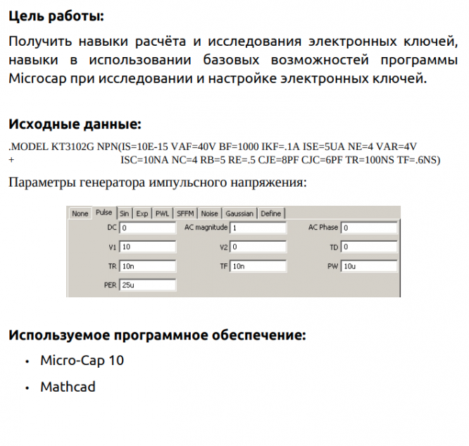 Цель работы: Получить навыки расчёта и исследования электронных ключей, навыки в использовании базовых возможностей программы Microcap при исследовании и настройке электронных ключей.
