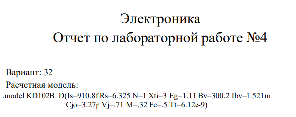 Вариант: 32 Расчетная модель: .model KD102B D(Is=910.8f Rs=6.325 N=1 Xti=3 Eg=1.11 Bv=300.2 Ibv=1.521m Cjo=3.27p Vj=.71 M=.32 Fc=.5 Tt=6.12e-9)