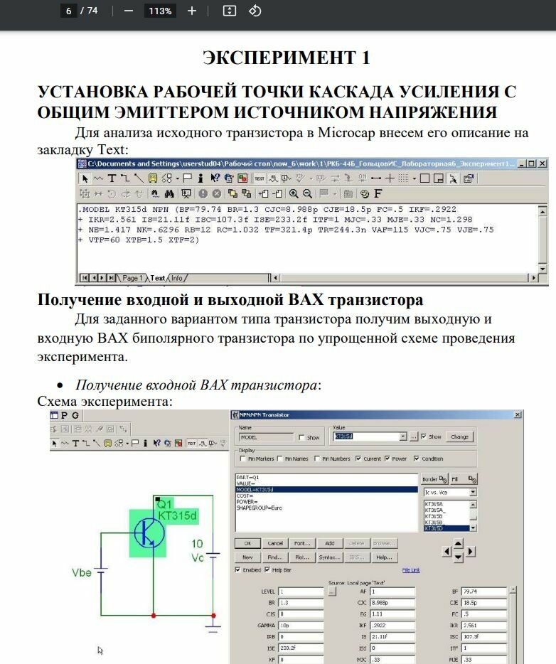 Возьмем исходные данные модели транзистора в соответствии с вариантом № 70 из файла Lib_Bipol.lib, который можно найти на сайте MOODLE. .model KT315d NPN(Is=21.11f Xti=3 Eg=1.11 Vaf=115 Bf=79.74 Ise=233.2f + Ne=1.417 Ikf=.2922 Nk=.6296 Xtb=1.5 Br=1.3 Isc=107.3f Nc=1.298 + Ikr=2.561 Rb=12 Rc=1.032 Cjc=8.988p Mjc=.33 Vjc=.75 Fc=.5 Cje=18.5p + Mje=.33 Vje=.75 Tr=244.3n Tf=321.4p Itf=1 Xtf=2 Vtf=60)