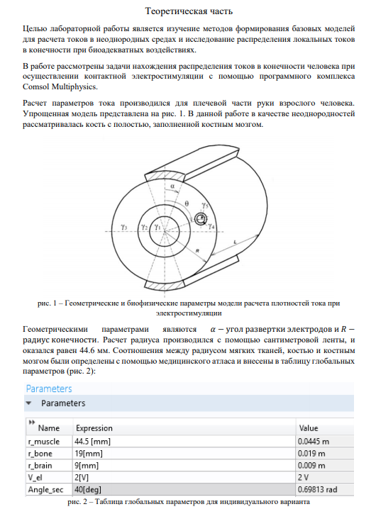 Целью лабораторной работы является изучение методов формирования базовых моделей для расчета токов в неоднородных средах и исследование распределения локальных токов в конечности при биоадекватных воздействиях. В работе рассмотрены задачи нахождения распределения токов в конечности человека при осуществлении контактной электростимуляции с помощью программного комплекса Comsol Multiphysics. Расчет параметров тока производился для плечевой части руки взрослого человека. Упрощенная модель представлена на рис. 1. В данной работе в качестве неоднородностей рассматривалась кость с полостью, заполненной костным мозгом.