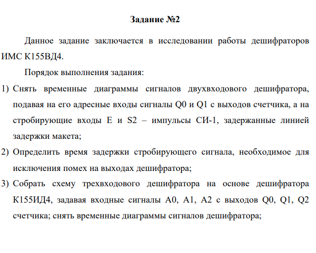 Задание №2 Данное задание заключается в исследовании работы дешифраторов ИМС К155ВД4. Порядок выполнения задания: 1) Снять временные диаграммы сигналов двухвходового дешифратора, подавая на его адресные входы сигналы Q0 и Q1 с выходов счетчика, а на стробирующие входы Е и S2 – импульсы СИ-1, задержанные линией задержки макета; 2) Определить время задержки стробирующего сигнала, необходимое для исключения помех на выходах дешифратора; 3) Собрать схему трехвходового дешифратора на основе дешифратора К155ИД4, задавая входные сигналы A0, A1, A2 c выходов Q0, Q1, Q2 счетчика; снять временные диаграммы сигналов дешифратора;
