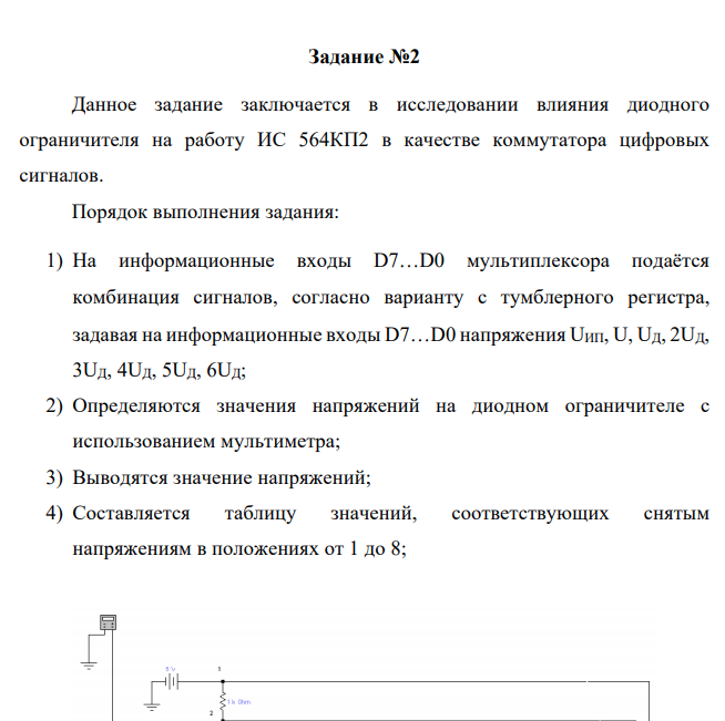 Задание №2 Данное задание заключается в исследовании влияния диодного ограничителя на работу ИС 564КП2 в качестве коммутатора цифровых сигналов. Порядок выполнения задания: 1) На информационные входы D7…D0 мультиплексора подаётся комбинация сигналов, согласно варианту с тумблерного регистра, задавая на информационные входы D7…D0 напряжения UИП, U, UД, 2UД, 3UД, 4UД, 5UД, 6UД; 2) Определяются значения напряжений на диодном ограничителе с использованием мультиметра; 3) Выводятся значение напряжений; 4) Составляется таблицу значений, соответствующих снятым напряжениям в положениях от 1 до 8;