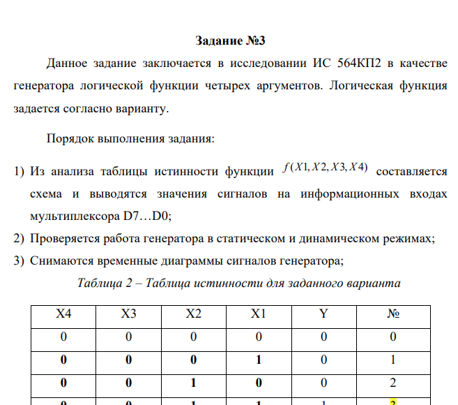 Задание №3 Данное задание заключается в исследовании ИС 564КП2 в качестве генератора логической функции четырех аргументов. Логическая функция задается согласно варианту. Порядок выполнения задания: 1) Из анализа таблицы истинности функции составляется схема и выводятся значения сигналов на информационных входах мультиплексора D7…D0; 2) Проверяется работа генератора в статическом и динамическом режимах; 3) Снимаются временные диаграммы сигналов генератора;